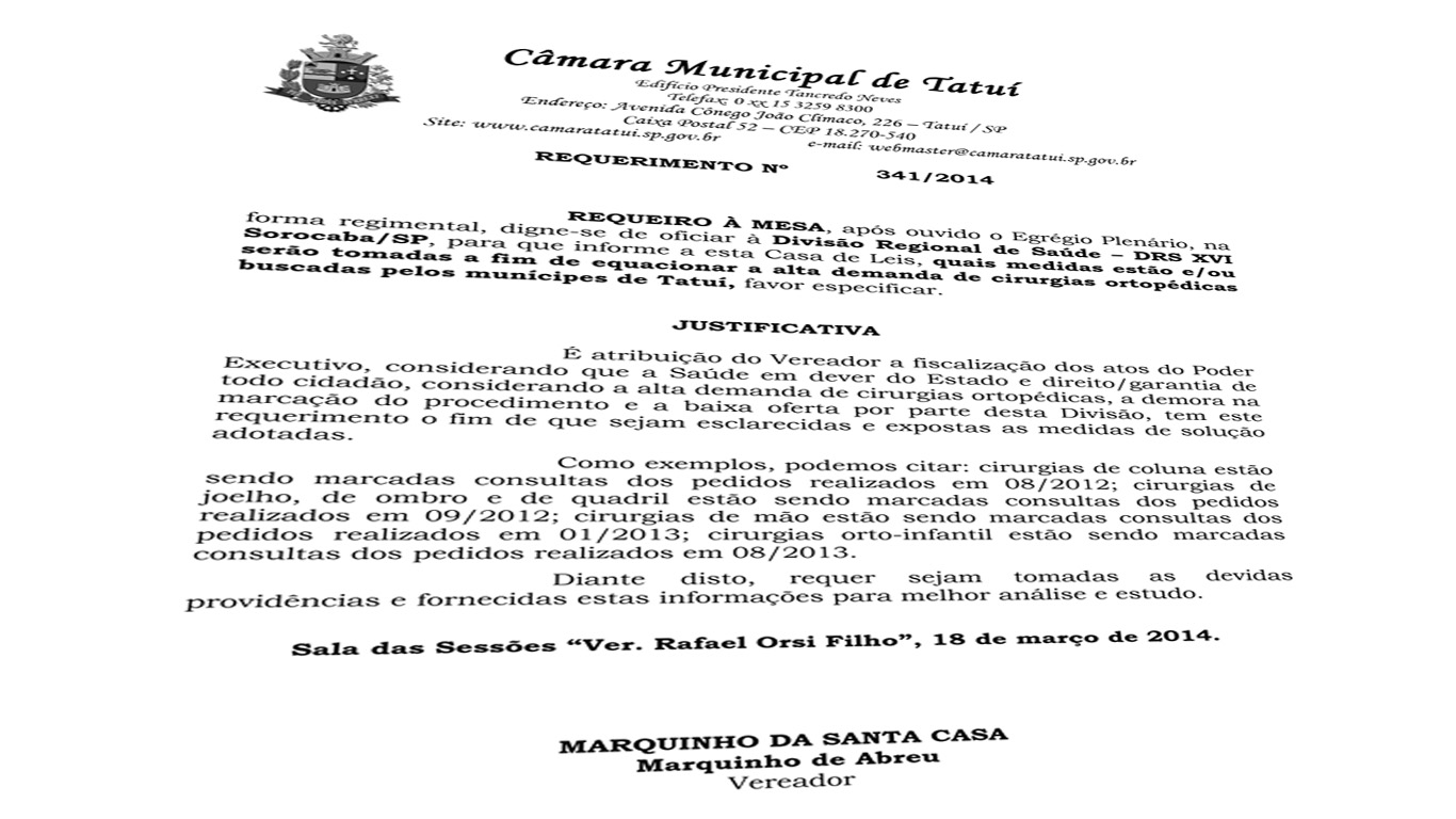 Em outro documento, Marquinho questionou o órgão sobre quais medidas estariam sendo tomadas a fim de equacionar a alta demanda de cirurgias ortopédicas.