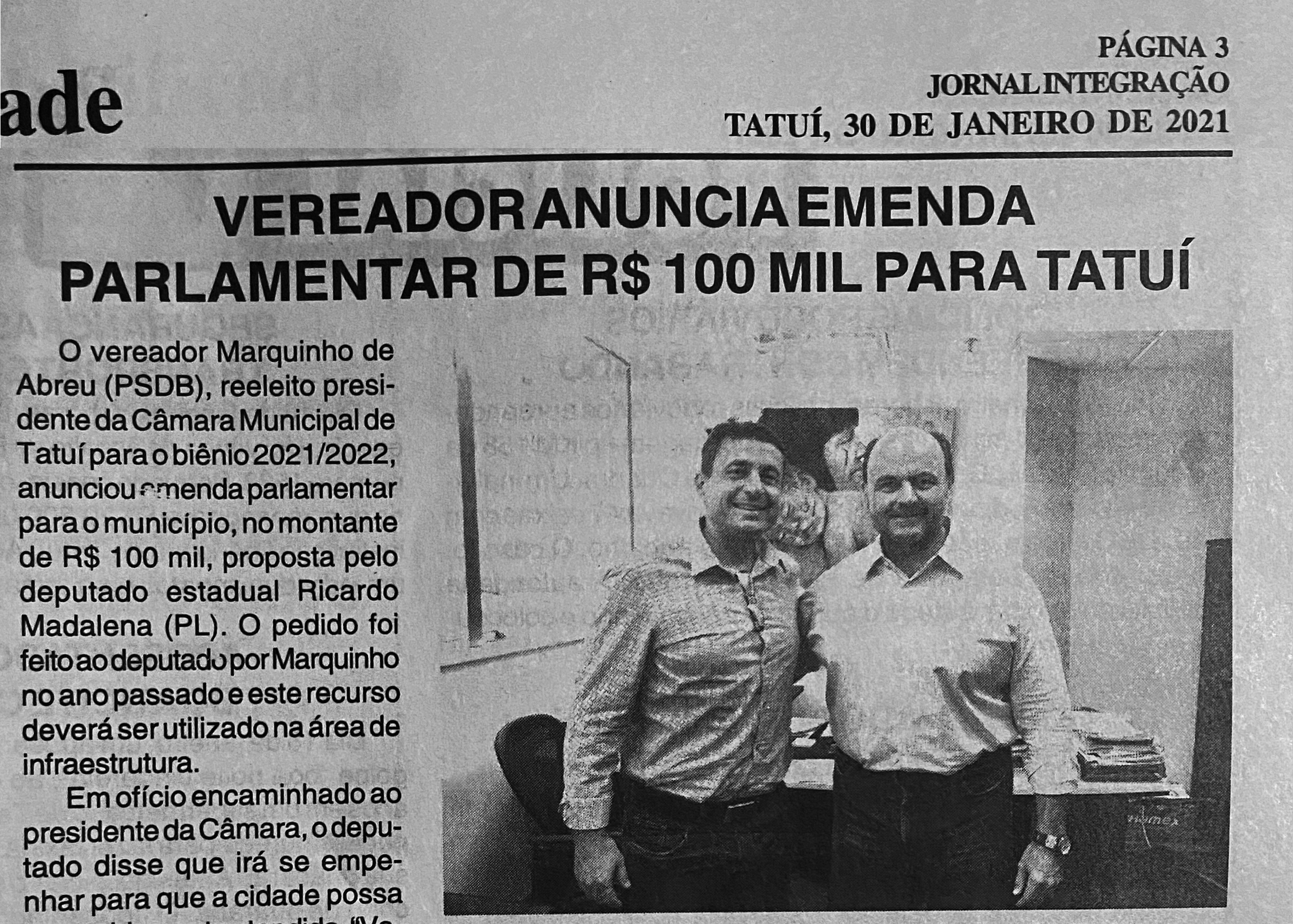 O vereador Marquinho de Abreu (PSDB), reeleito presidente da Câmara Municipal de Tatuí para o biênio 2021/2022, anunciou emenda parlamentar para o município, no montante de R$ 100 mil, proposta pelo deputado estadual Ricardo Madalena (PL). O pedido foi feito ao deputado por Marquinho no ano passado e este recurso deverá ser utilizado na área de infraestrutura.