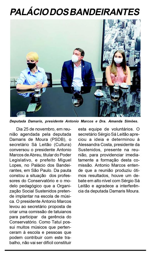 Dia 25 de novembro, em reunião agendada pela deputada Damaris de Moura (PSDB), o secretário Sá Leitão (Cultura) conversou o presidente Antonio Marcos de Abreu, titular do Poder Legislativo, e prefeito Miguel Lopes, no Palácio dos Bandeirantes, em São Paulo.