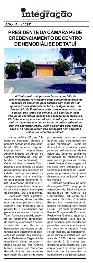 Como vereador ligado à Saúde em Tatuí, Antonio Marcos afirma que “sabemos das dificuldades dos pacientes que viajam de duas a três vezes A Clínica Nefrotat, pronta e fechada por falta de credenciamento. A Prefeitura paga a mobilidade diária de dezenas de pacientes para cidades com mais de 100 quilômetros de distância de Tatuí. Há algum tempo, um funcionário da Prefeitura contou a este semanário que seu pai, três vezes por semana, ia à São Paulo, com veículo da Prefeitura, passar por sessões de hemodiálise. Ele tinha que esperar a condução de volta, por horas, com outros pacientes que iam se tratar de outras enfermidades, em diferentes locais. O filho disse que o pai tinha 82 anos e, na hora do jantar, não conseguia nem segurar a colher por estar tão debilitado. por semana, junto com outros doentes para tratamentos em outros municípios”.