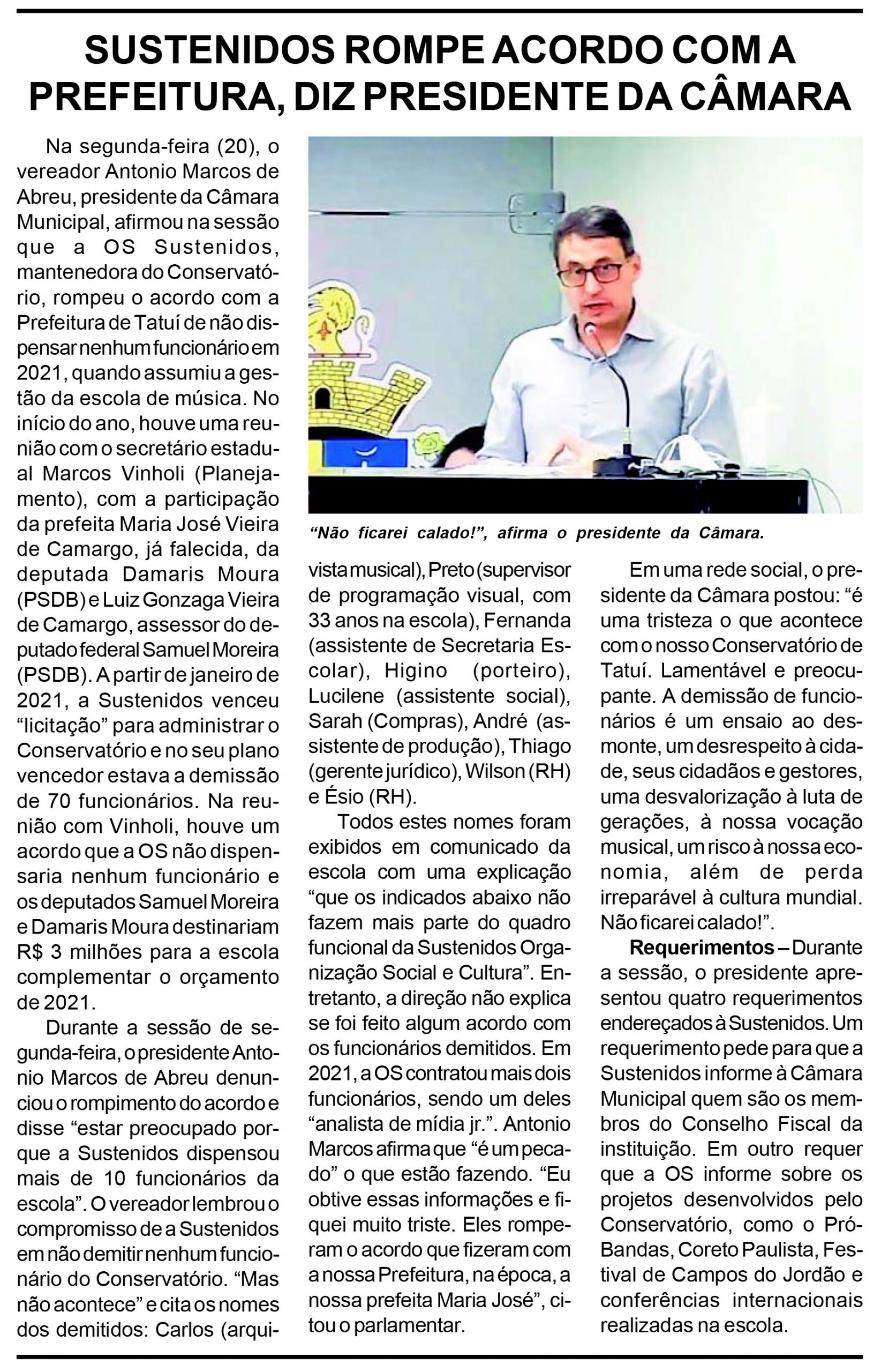 Na segunda-feira (20), o vereador Antonio Marcos de Abreu, presidente da Câmara Municipal, afirmou na sessão que a OS Sustenidos, mantenedora do Conservatório, rompeu o acordo com a Prefeitura de Tatuí de não dispensar nenhum funcionário em 2021, quando assumiu a gestão da escola de música. No início do ano, houve uma reunião com o secretário estadual Marcos Vinholi (Planejamento), com a participação da prefeita Maria José Vieira de Camargo, já falecida, da deputada Damaris Moura (PSDB) e Luiz Gonzaga Vieira de Camargo, assessor do deputado federal Samuel Moreira (PSDB). A partir de janeiro de 2021, a Sustenidos venceu “licitação” para administrar o Conservatório e no seu plano vencedor estava a demissão de 70 funcionários. Na reunião com Vinholi, houve um acordo que a OS não dispensaria nenhum funcionário e os deputados Samuel Moreira e Damaris Moura destinariam R$ 3 milhões para a escola complementar o orçamento de 2021.